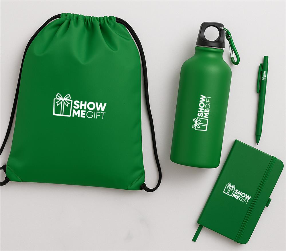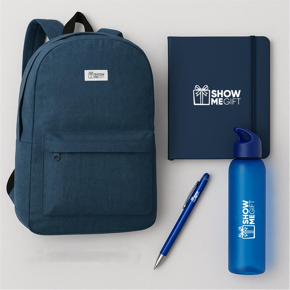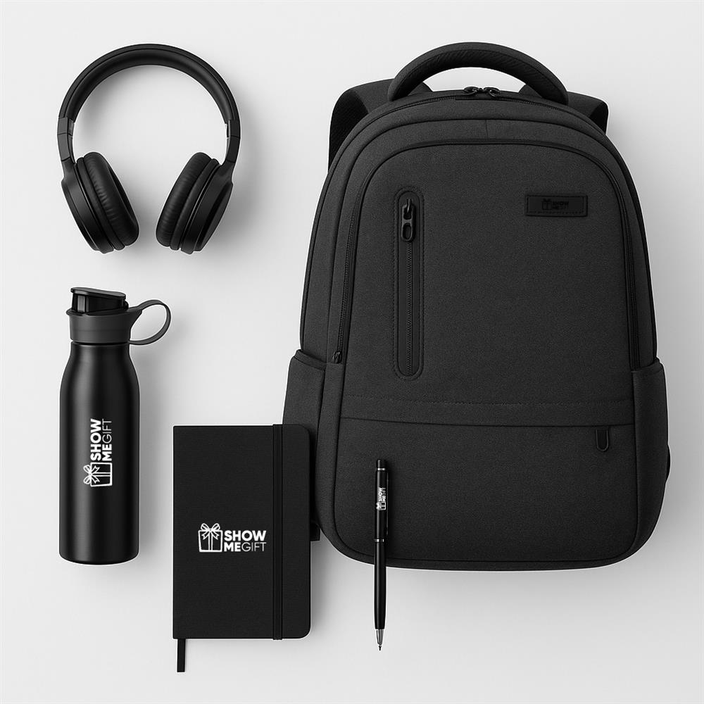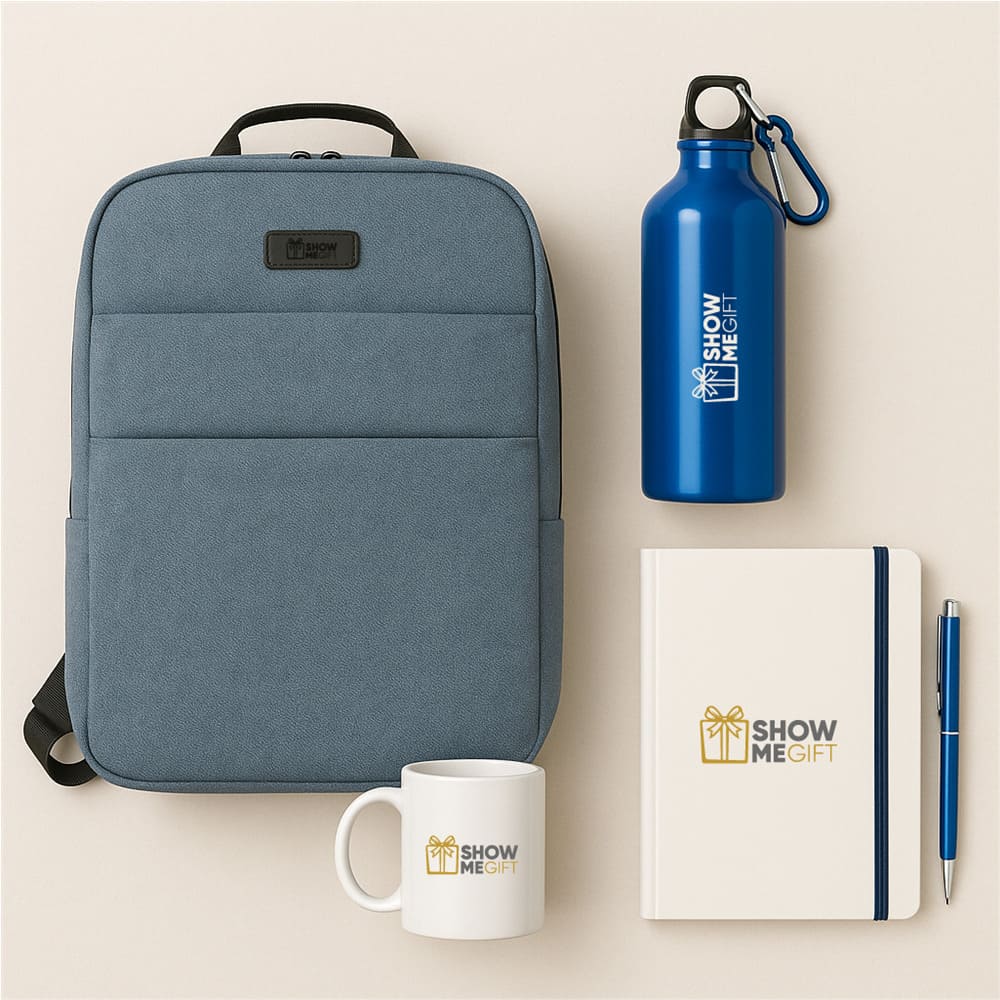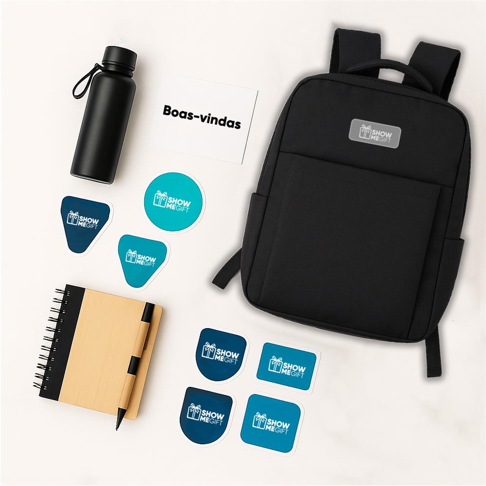 Kit com mochila, garrafa de água, caneta e caderno — todos personalizados com sua marca. Ideal para ações de onboarding, eventos e campanhas corporativas.