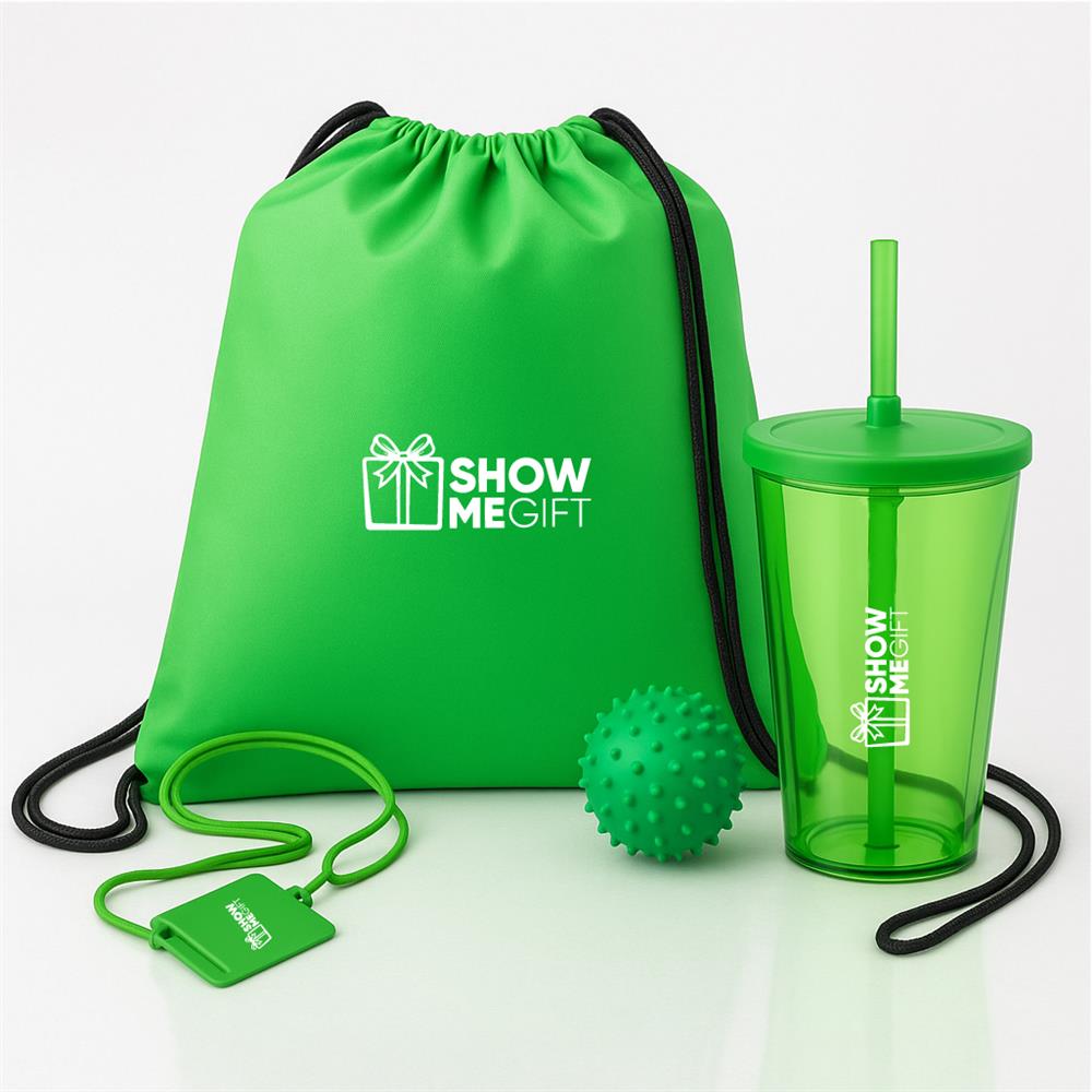 Kit onboarding com copo 550ml, mochila saco poliéster, chill antiestresse em PU e tag de bagagem. Ideal para ações promocionais e integração leve.
