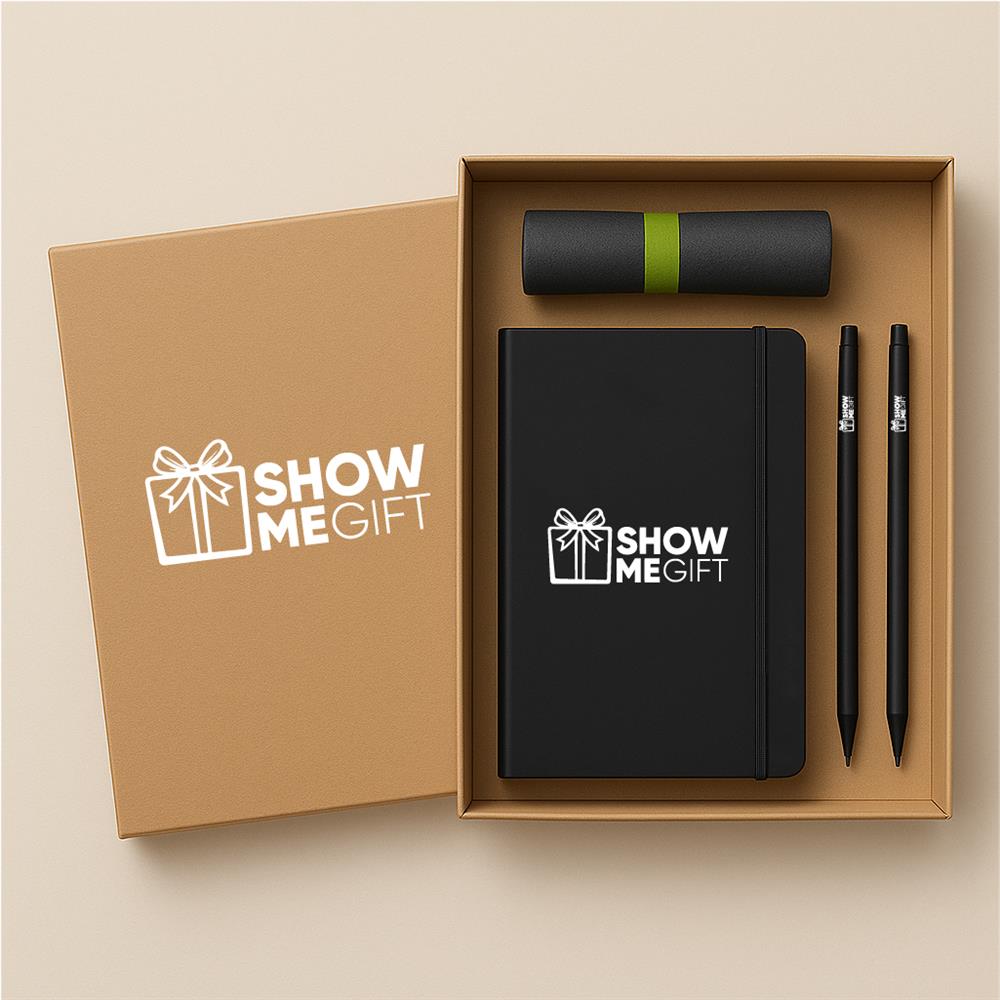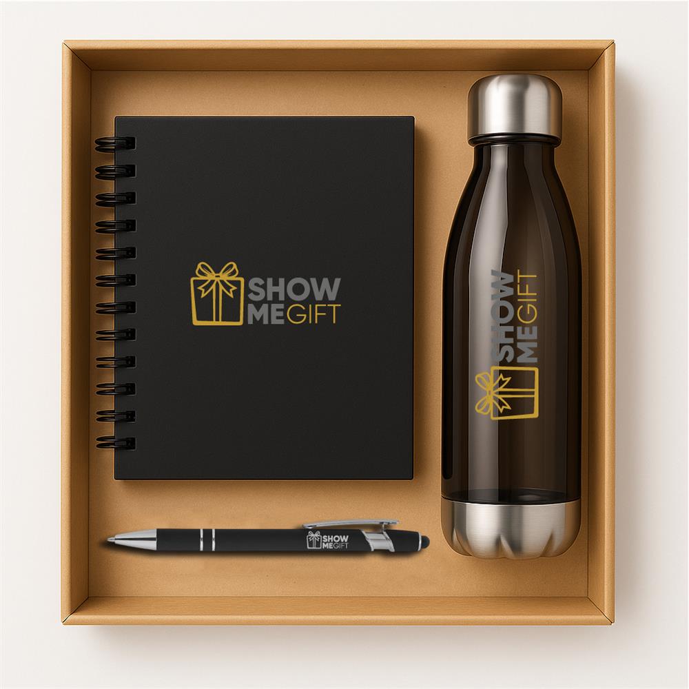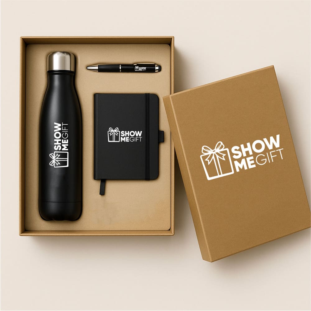 Kit com garrafa em inox, agenda A5 e caixa duplex personalizada. Ideal para brindes corporativos, ações de onboarding e campanhas promocionais elegantes.