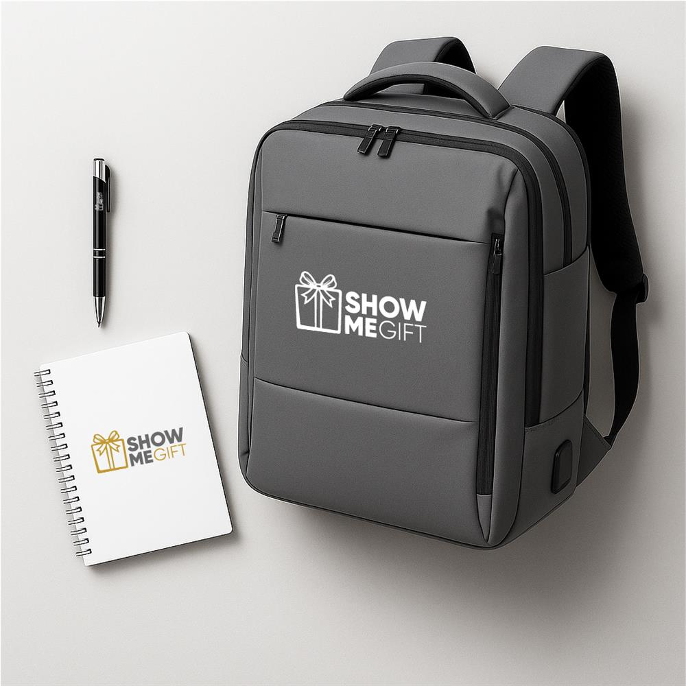 Kit com garrafa 630ml, caderneta em couro sintético, caneta metálica e mochila USB 21L — todos personalizados com DTF. Brinde moderno e marcante.
