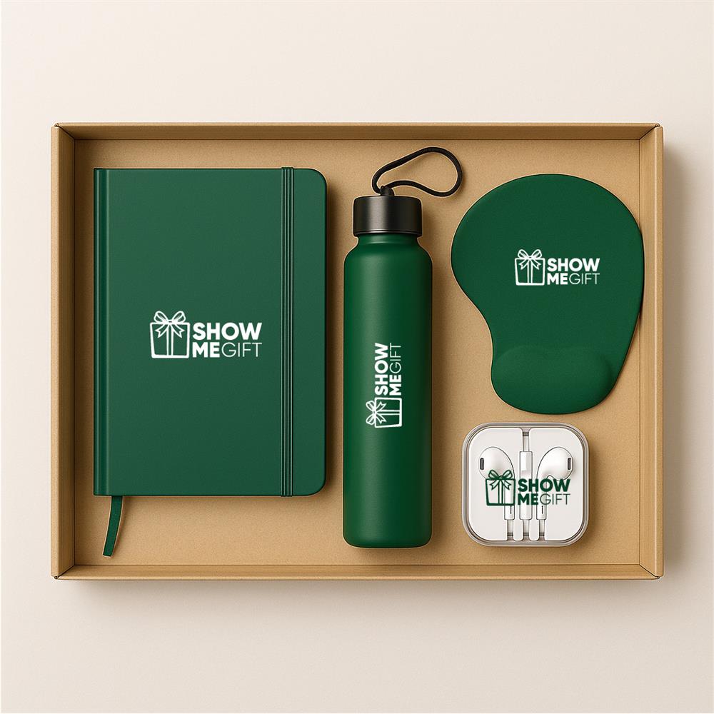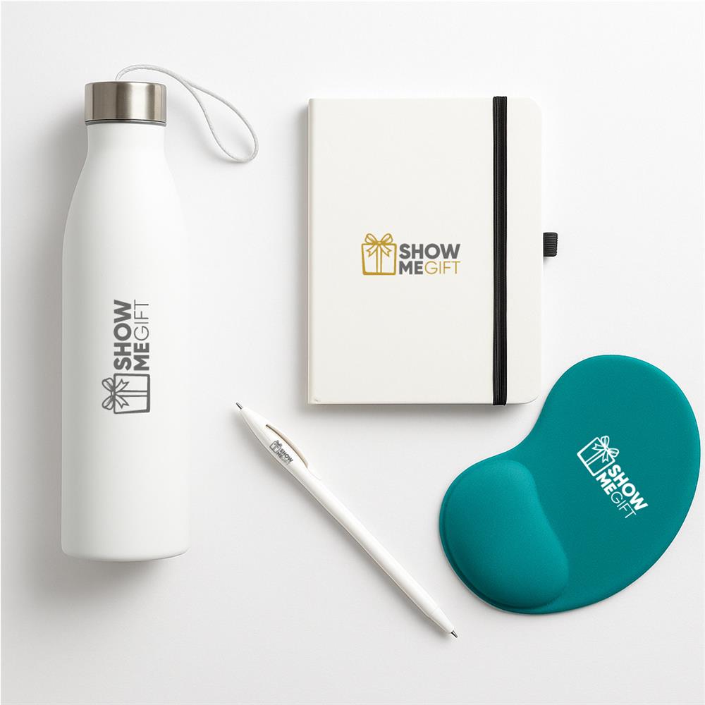 Kit corporativo com garrafa, mousepad, caneta e moleskine com suporte. Brinde funcional, elegante e ideal para ações de onboarding e eventos empresariais.