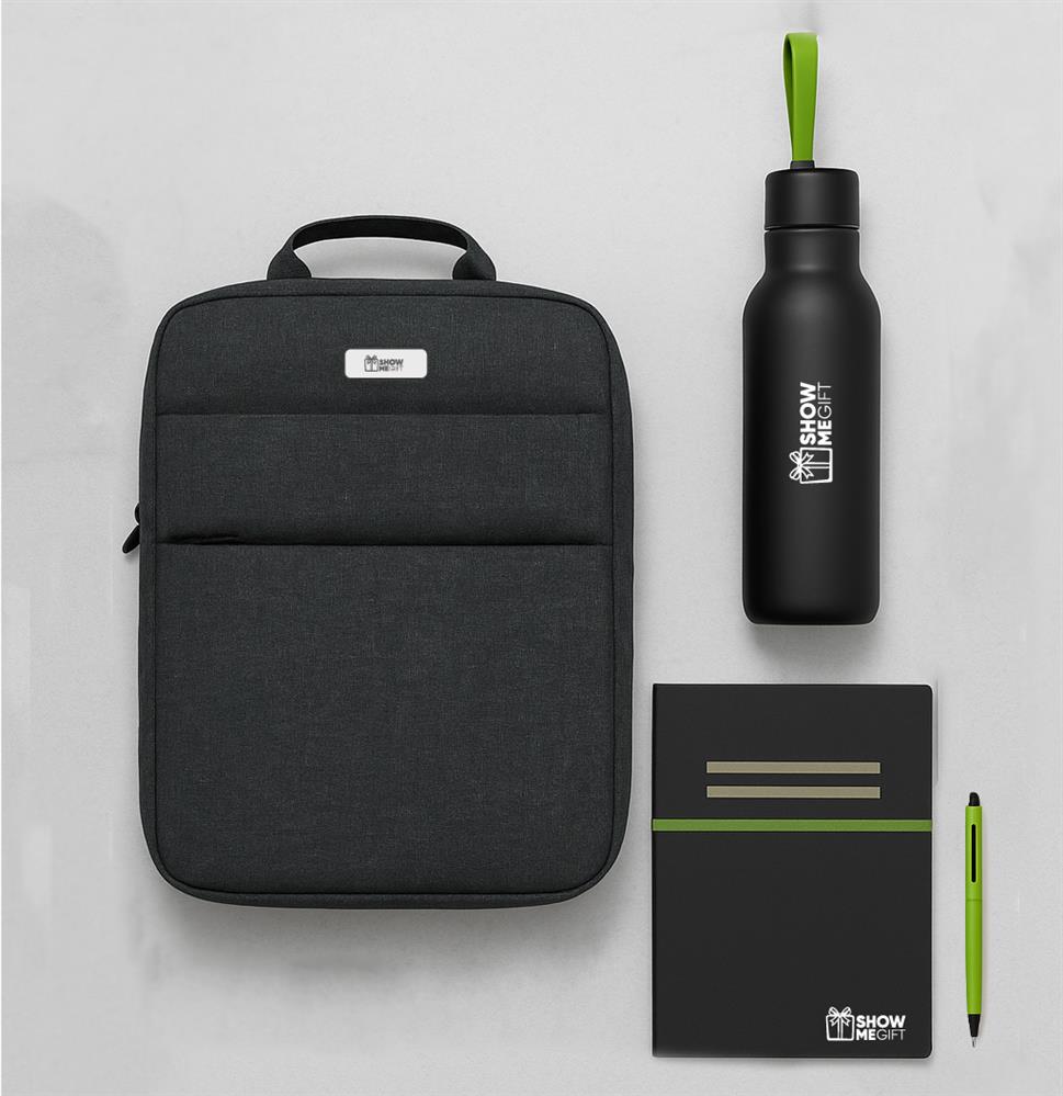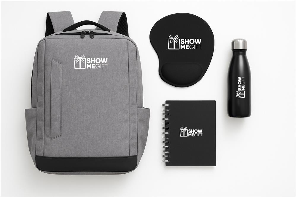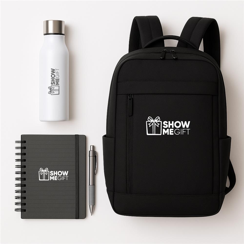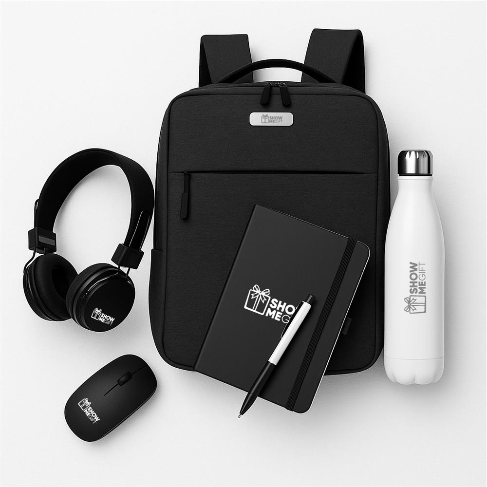 O kit compõe: 1 Mochila para notebook 15.6" personalizada 1 Caneca de cerâmica personalizada 1 Squeeze de alumínio com mosquetão personalizado 1 Caderneta com porta-caneta personalizado 1 Caneta de metal personalizado