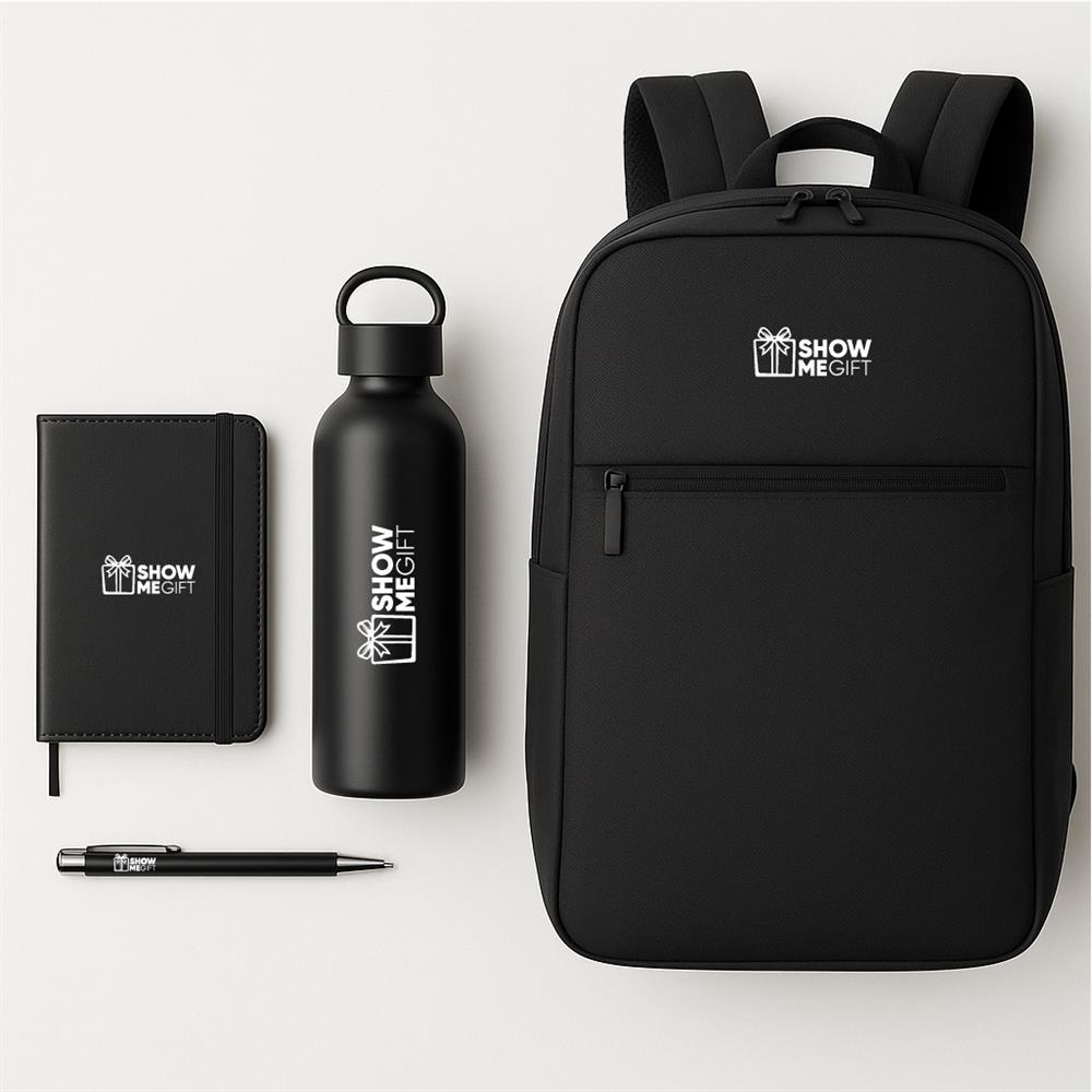 Kit onboarding com mochila para notebook, garrafa térmica em inox, caneta touch e caderno estilo moleskine. Elegância e funcionalidade para novos talentos.