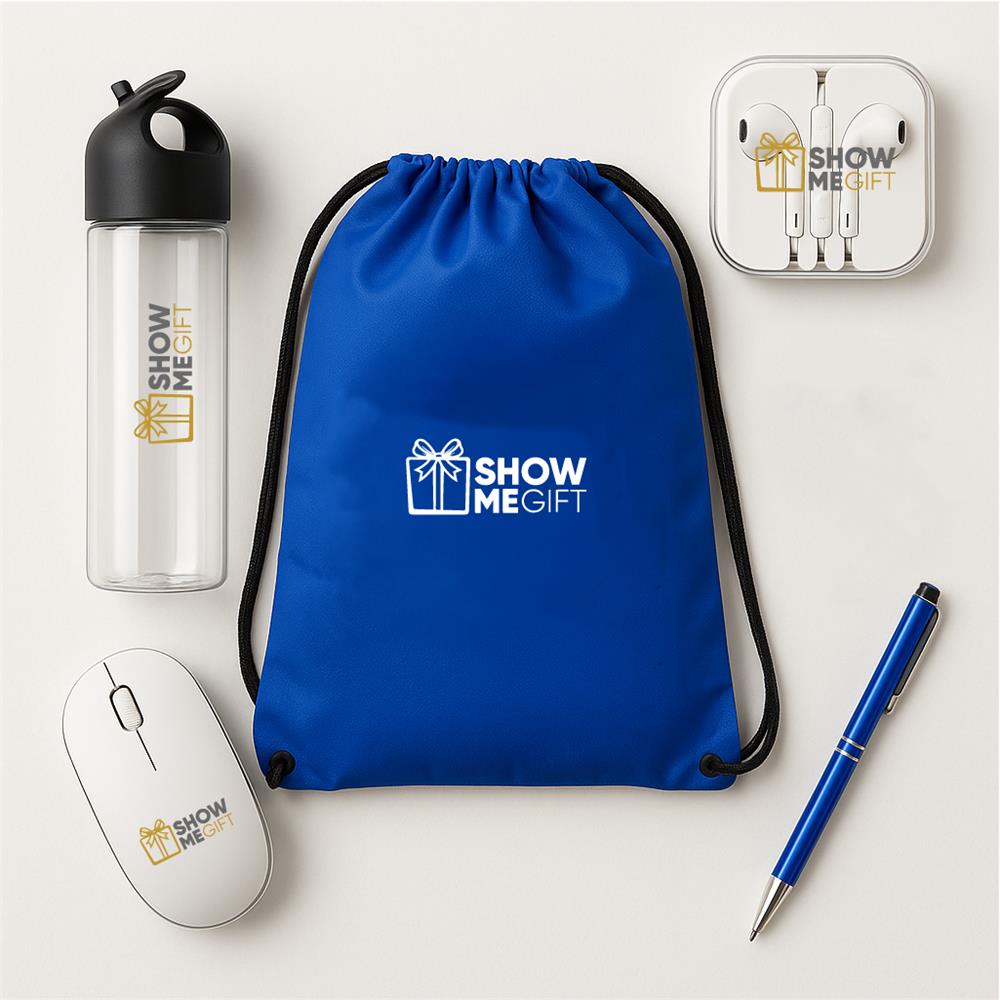 O kit contém: 1 Mochila saco em nylon 1 Squeeze plástico personalizado (500ml) 1 Caneta de metal personalizada 1 Fone de ouvido com microfone integrado 1 Mouse óptico personalizado