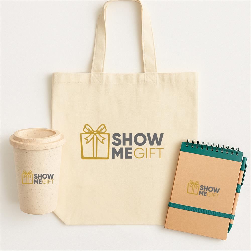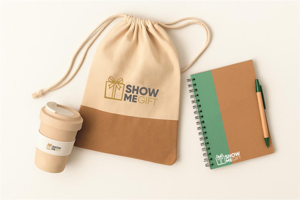 Kit sustentável com caderneta e caneta, copo de fibra de arroz e sacola ecológica de algodão. Ideal para ações de ESG, eventos e brindes conscientes.