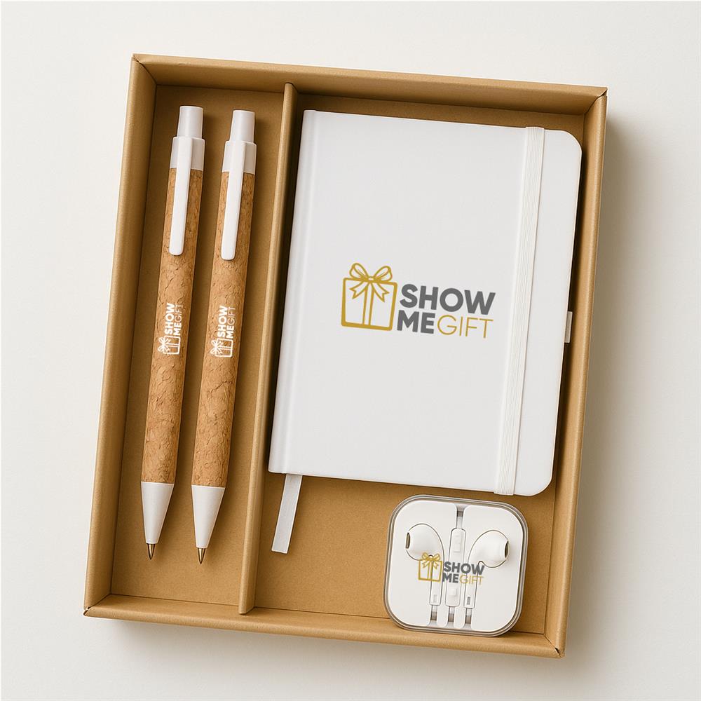Kit de Boas-Vindas Corporativo Ecológico com Fone de Ouvido. Ideal para onboarding de novos colaboradores. Inclui fone com microfone, caderneta em couro sintético, caneta e lapiseira ecológicas em kraft e caixa personalizada. Brinde sustentável para empresas, ESG, ações de integração e presentes institucionais personalizados.