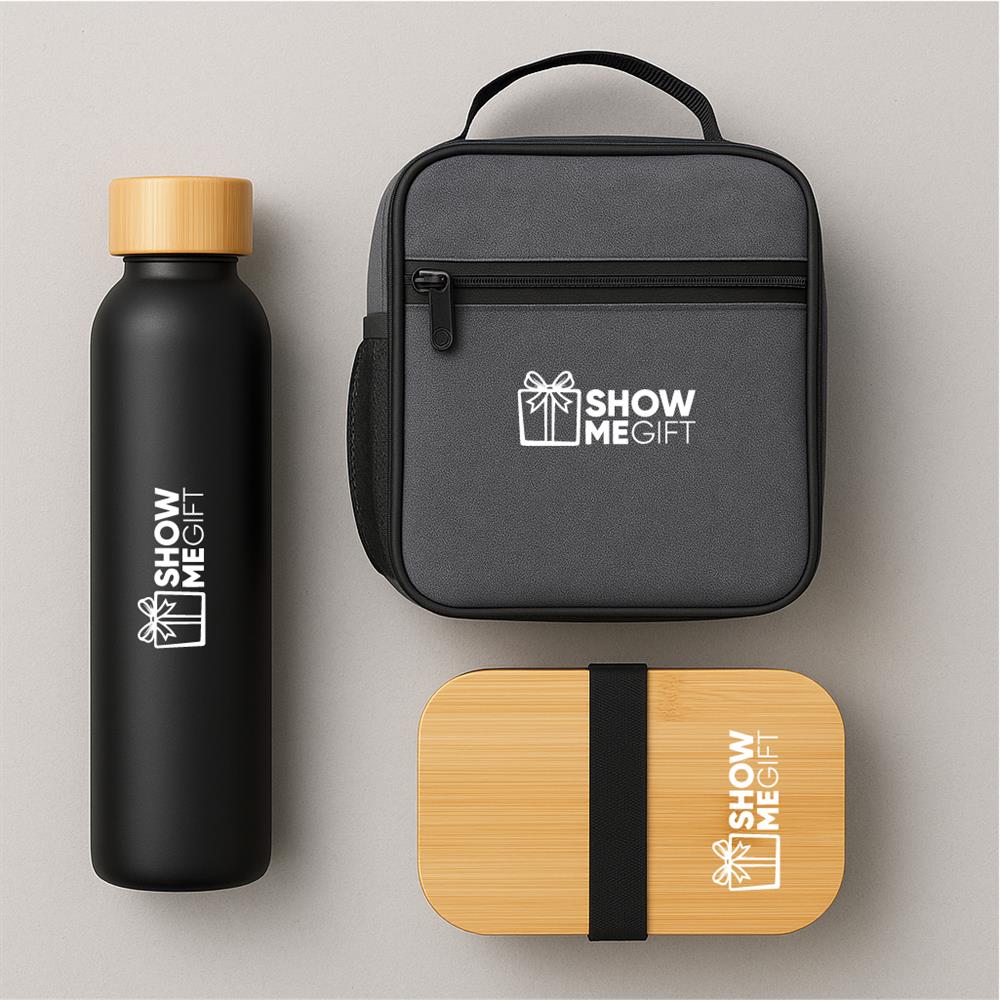 Kit com marmita inox 800ml, squeeze alumínio 550ml com tampa de bambu e bolsa térmica. Ideal para ações sustentáveis, bem-estar e brindes corporativos.
