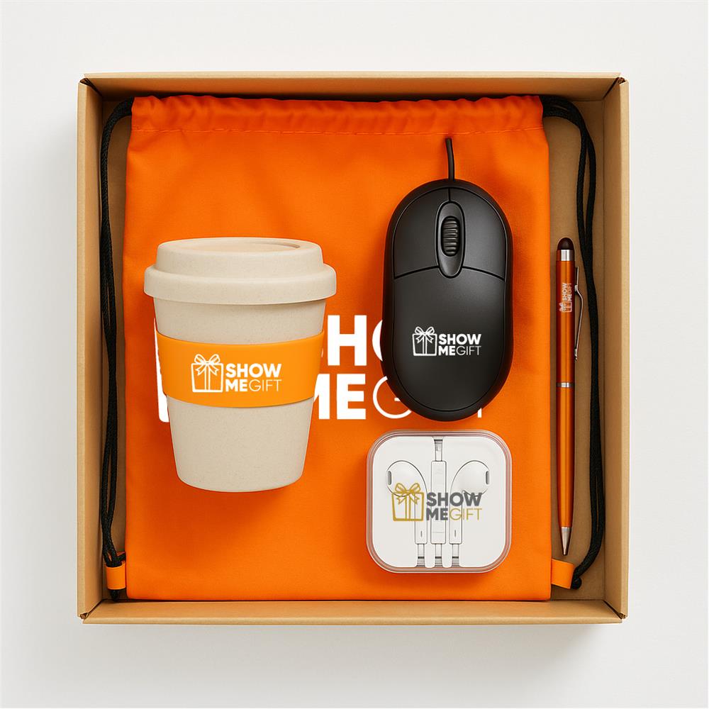 Kit de boas-vindas com fone de ouvido, caneta touch, copo de bambu, mochila saco e mouse com fio. Funcional, moderno e ideal para novos colaboradores.
