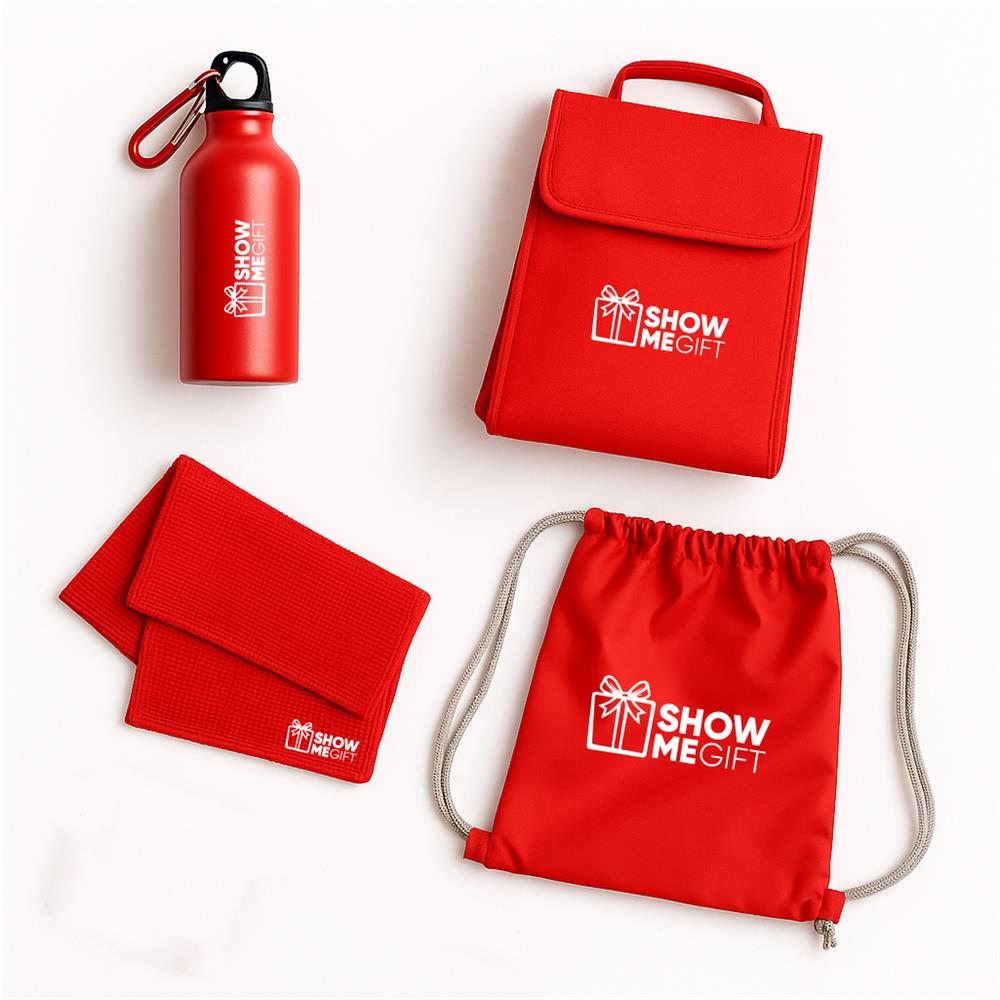 Kit com garrafa de alumínio 420ml, toalha personalizada, mochila saco colorida e bolsa térmica dobrável 2L. Ideal para ações externas e eventos corporativos.